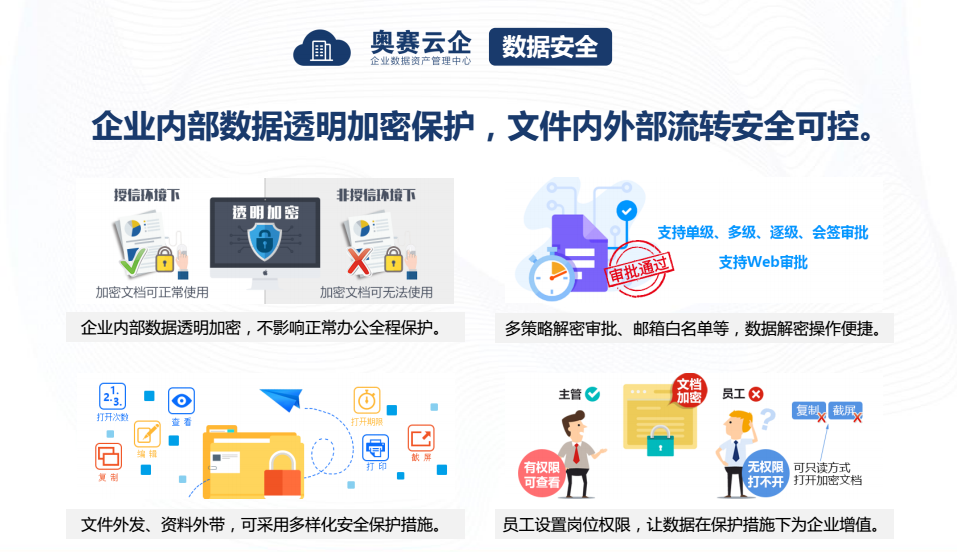 奧賽云企的數(shù)據(jù)加密與加密可采用多樣化的靈活策略,可針對(duì)指定文檔格式進(jìn)行加密。解密外發(fā)可設(shè)置郵箱白名單(發(fā)送者白名單、接收者白名單),提高辦公對(duì)接效率。并可以通過(guò)手機(jī)App進(jìn)行在線查閱及解密,降低管理難度。