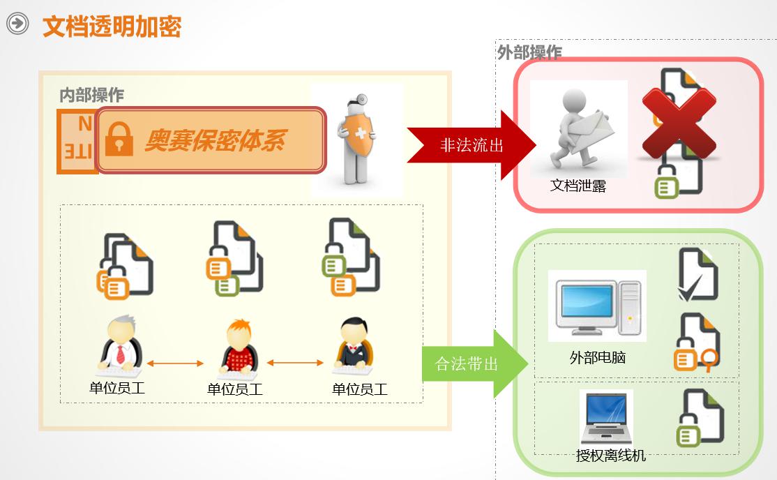 奧賽云盾采用先進的文件內(nèi)核加密技術(shù),在無需人工干預(yù)、不影響員工辦公的前提下對數(shù)據(jù)進行全程智能加密,在內(nèi)部環(huán)境可正常使用,脫離內(nèi)部授權(quán)環(huán)境則無法打開。根據(jù)實際業(yè)務(wù)需求可使用打開加密、修改加密、手動加密、智能加密等靈活多樣的加密策略。