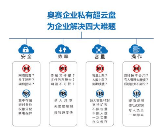 奧賽企業(yè)私有云盤(pán)在硬件存儲(chǔ)設(shè)備基礎(chǔ)上,嫁接了性能卓越的操作系統(tǒng),方便您對(duì)寶貴的數(shù)據(jù)集中存儲(chǔ),提高辦公效率,降低企業(yè)對(duì)IT設(shè)備的總投入與維護(hù)成本,為中小企業(yè)提供值得信賴(lài)的數(shù)據(jù)解決方案。