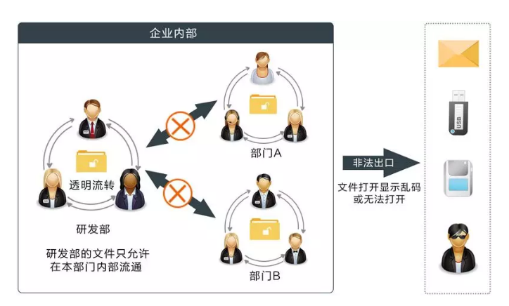 奧賽云盾采用驅(qū)動(dòng)層加密技術(shù),進(jìn)行文件加密,不改變員工操作習(xí)慣、不改變文件格式、不封閉公司網(wǎng)絡(luò)、不封閉外設(shè)端口,內(nèi)部流通自由正常。 加密文件在未授權(quán)的情況下脫離企業(yè)網(wǎng)絡(luò),文件就無法正常訪問,形成“對(duì)外受阻,對(duì)內(nèi)無礙”局面!有效保障企業(yè)的數(shù)據(jù)安全。