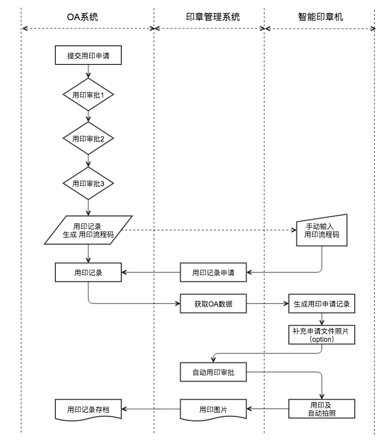 用戶的用印申請和審批流程在OA系統(tǒng)內(nèi)完成,審批通過后,與印章系統(tǒng)通過設(shè)定接口在服務(wù)管理后臺進行通訊,將用印申請和審批的詳細內(nèi)容傳輸?shù)接≌孪到y(tǒng),并發(fā)送到智能印章機上。用印用戶在智能印章機上完成用印行為。通過標準通信接口的方式,智能印章系統(tǒng)和OA系統(tǒng)之間可以實現(xiàn)完美的對接,不但可以迅速完成整體部署,降低時間和開發(fā)成本,而且可以有效降低用戶的學(xué)習(xí)成本。