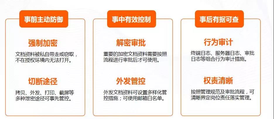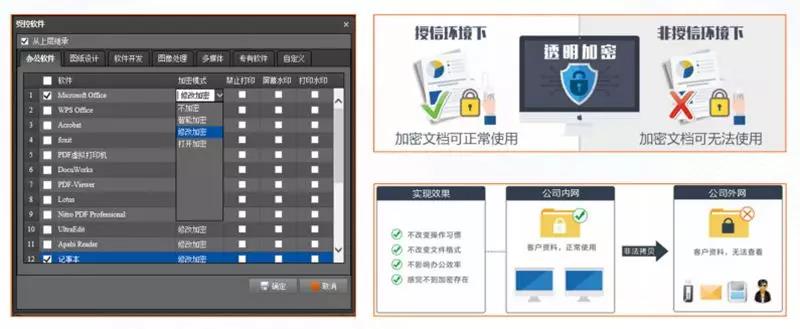重要數(shù)據(jù)資料在加密基礎上,實現(xiàn)內(nèi)外部數(shù)據(jù)流轉(zhuǎn)管控。核心重要資料的非常規(guī)內(nèi)部使用,必須經(jīng)過解密審批單獨授權公司外部的流轉(zhuǎn)使用,可通過限定次數(shù)限定時間、限定電腦限定對象來進行管控。
