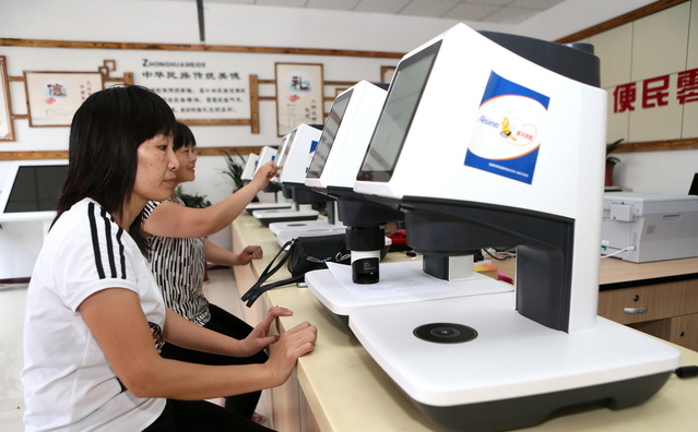 6月22日,山東即墨市藍(lán)村鎮(zhèn)王演莊北村的村民王芳(前)通過(guò)“智能蓋章機(jī)”辦理蓋章手續(xù)。日前,即墨市首批“智能蓋章機(jī)”在藍(lán)村鎮(zhèn)王演莊社區(qū)服務(wù)中心投入使用?!爸悄苌w章機(jī)”具有頭像掃描、資料蓋章、圖文存檔、信息查閱等功能,村民辦理戶口遷移、政策補(bǔ)貼等用章事物時(shí)可自助辦理。