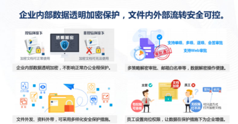 數(shù)據(jù)加密:保護核心數(shù)據(jù),杜絕各種途徑泄密。文檔全部自動加密,數(shù)據(jù)保護全面升級。重要的文件類型自動加密,未經(jīng)授權無法打開;重要部門/人員的機要文件自動加密,及時丟失也不怕。