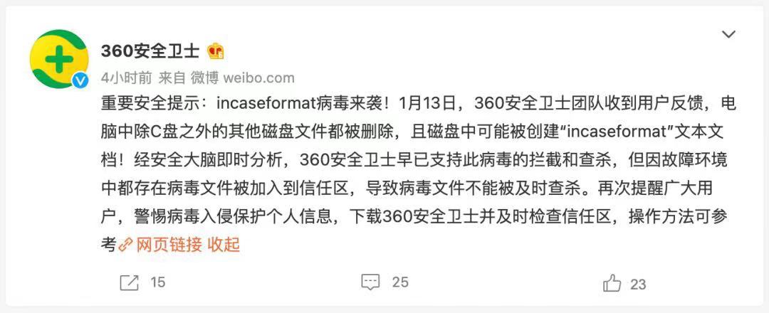 2021年1月13日,深信服、360、火絨安全實驗室等國內(nèi)安全公司對外發(fā)布預(yù)警,稱一種名為incaseformat的蠕蟲病毒在國內(nèi)爆發(fā)。incaseformat病毒爆發(fā),涉及醫(yī)療、教育、運營商等多個行業(yè),且感染多為財務(wù)管理相關(guān)應(yīng)用系統(tǒng),感染表現(xiàn)為所有非系統(tǒng)分區(qū)文件均被刪除。