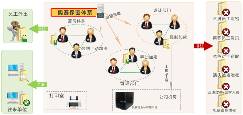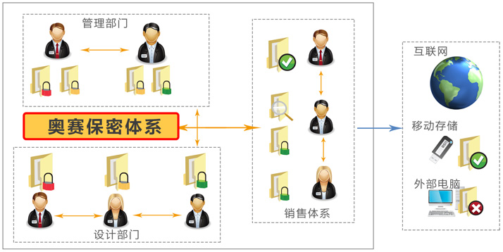 奧賽云盾反泄密軟件的加密過程不會因修改程序或進程名,更改保存文件后綴等作弊手段而失效,同時加密文檔的復(fù)制/剪切/拖放/粘貼等操作也受到限制, 向非加密文件中拖放/拷貝/粘貼的操作將被自動禁止。除此以外,奧賽云盾反泄密軟件對打印機,U盤等存儲工具,筆記本電腦均有控制措施, 并借助分組策略和身份權(quán)限的認(rèn)證管理等技術(shù)進行更細(xì)化的設(shè)置和保護。